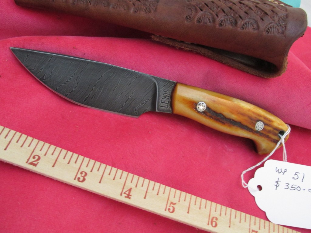Blade is pattern welded Damascus, 320 layers in a twist pattern. Handle is bone. $350